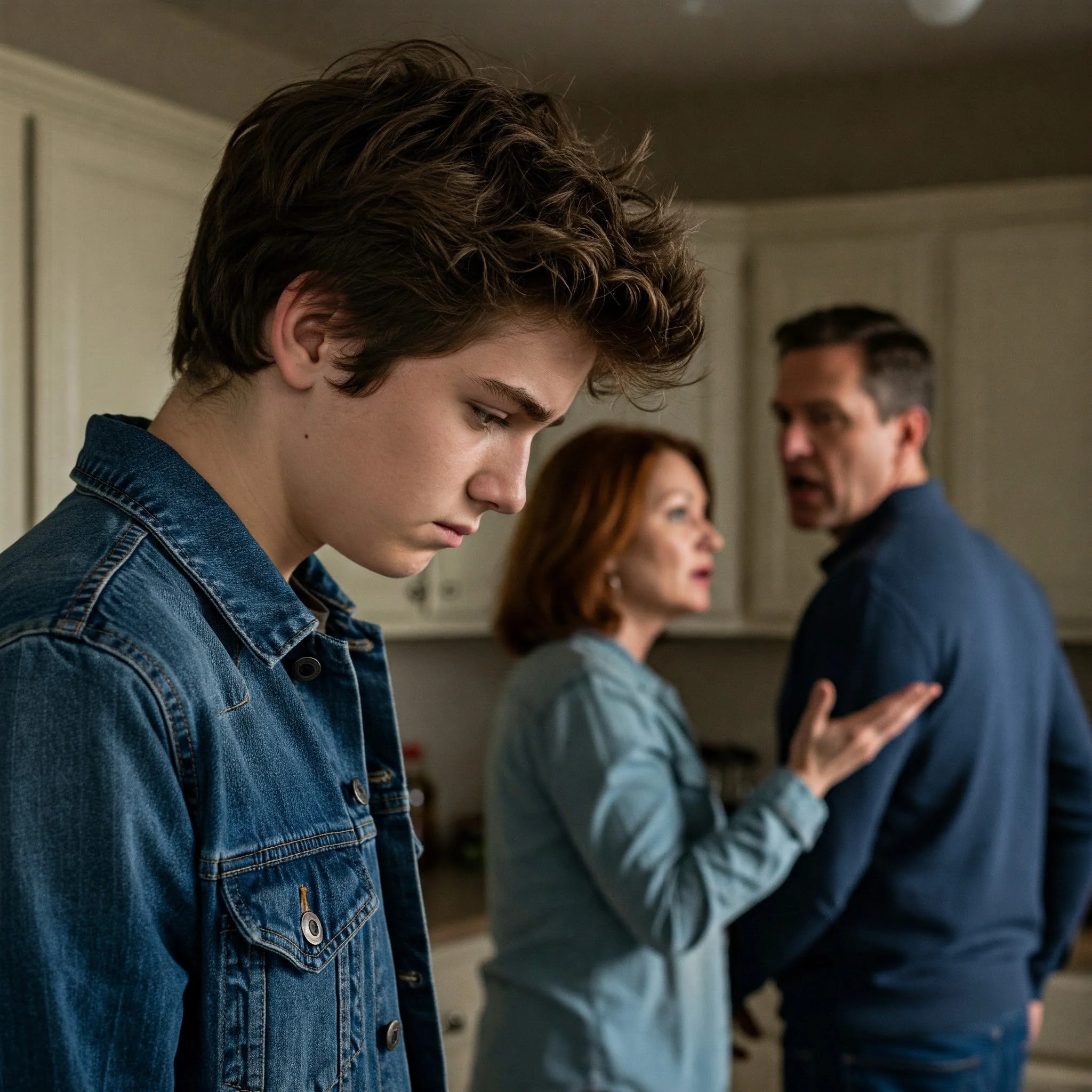 A young man with curly brown hair wearing a denim jacket looking down and away in a kitchen. In the background, a woman with red hair and a man with dark hair are engaged in a serious conversation, with the woman's hand on the man's chest.