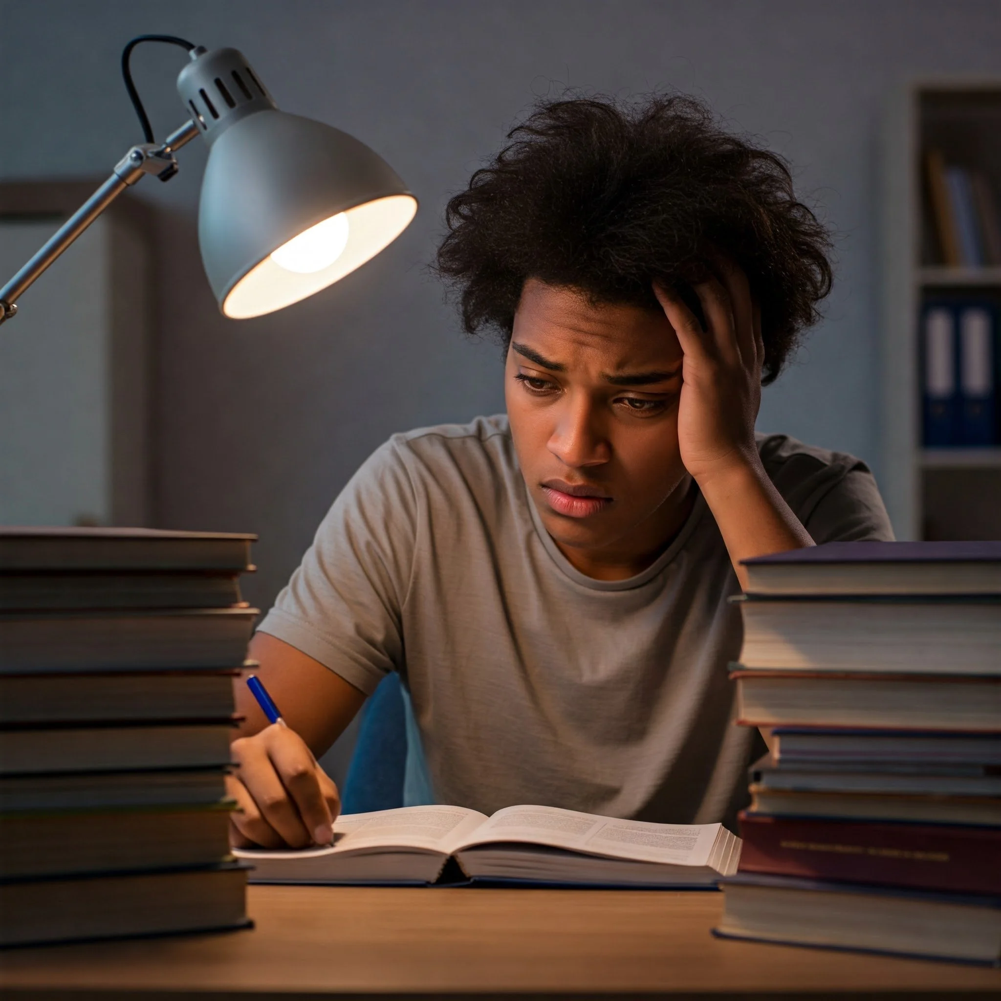 Young woman studying at a desk with multiple stacks of books, holding a pen and looking stressed or overwhelmed.