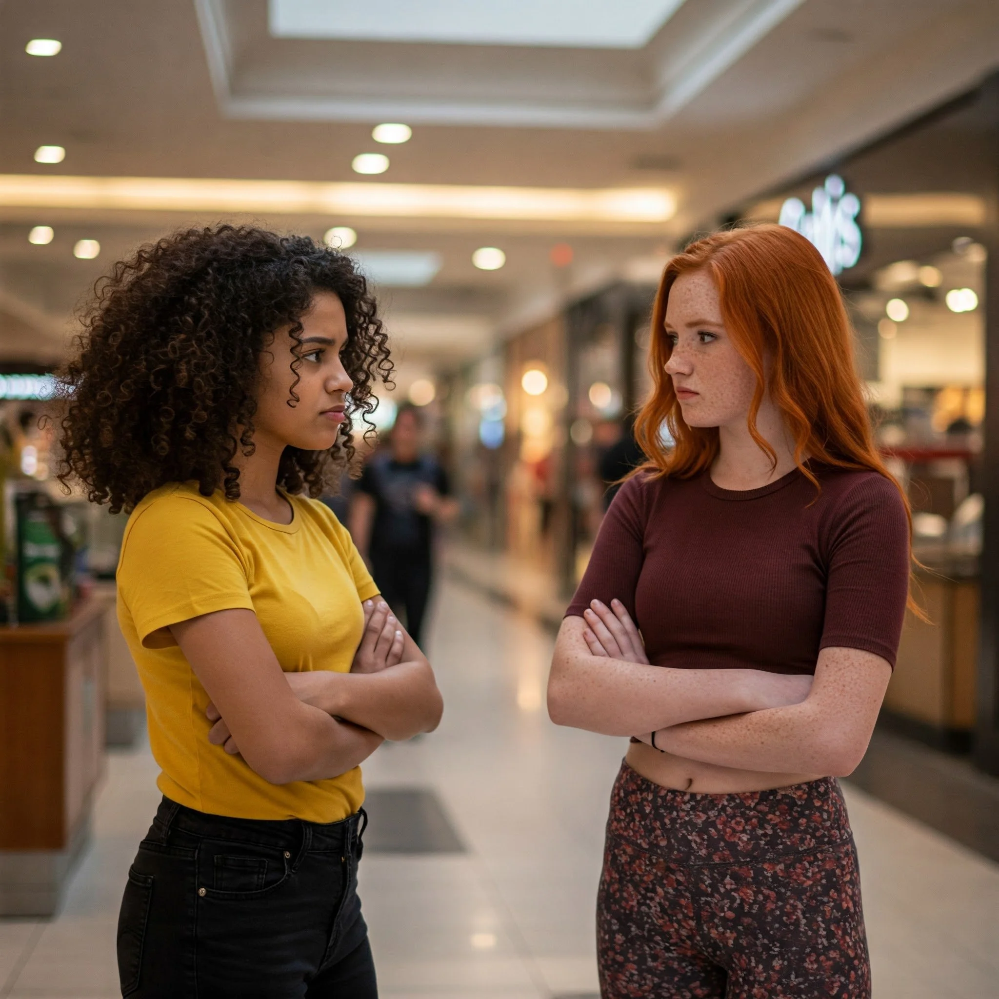 Two young women with crossed arms facing each other with serious expressions inside a shopping mall.