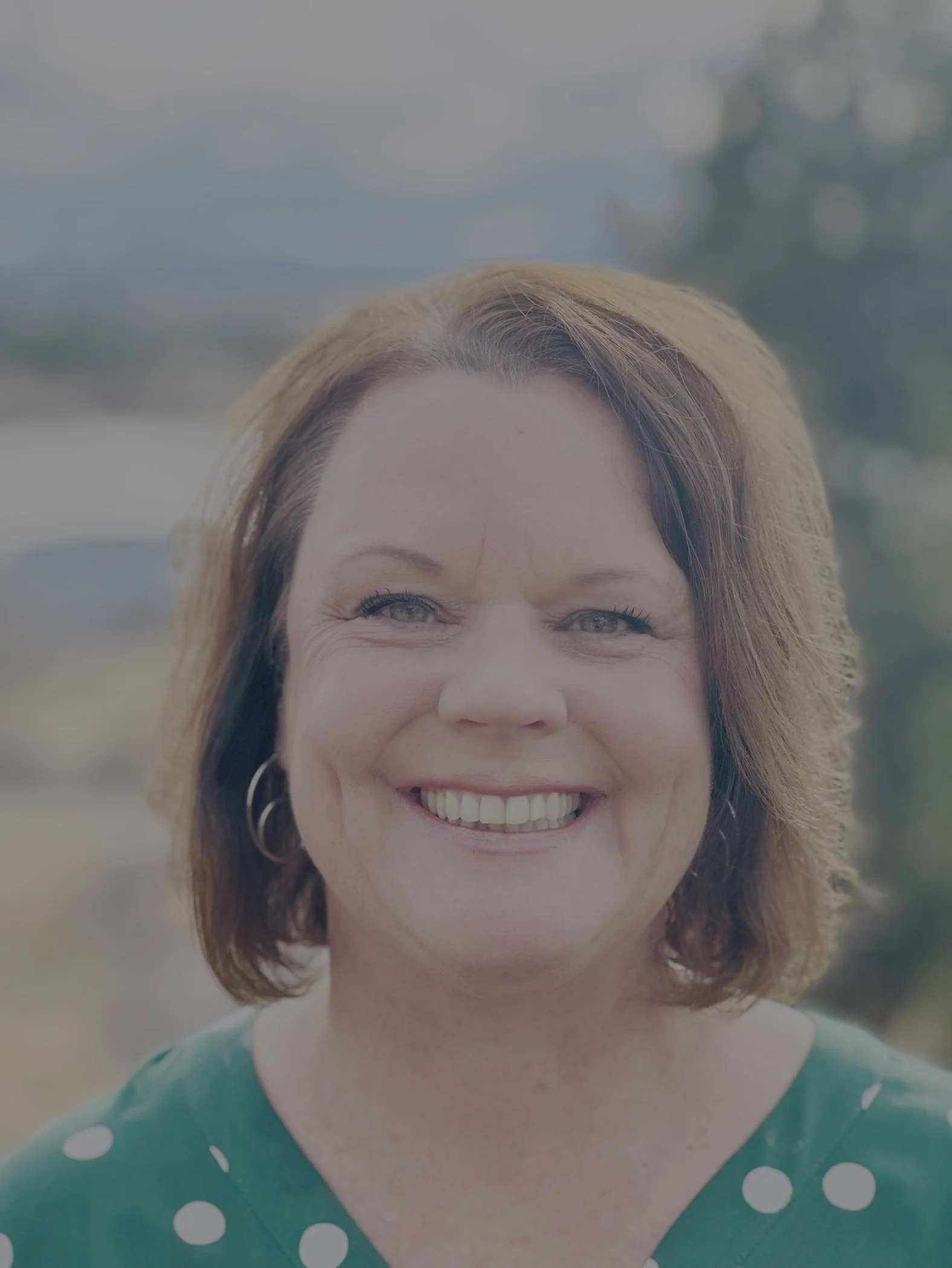 Close-up of a smiling woman with shoulder-length brown hair, wearing a green top with white polka dots, outdoors with blurred natural background.